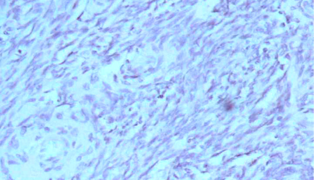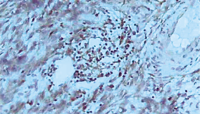 Рис. 5. Экспрессия антигенов СD16+ клеточной поверхности Т-лимфоцитов в ткани доброкачественной опухоли яичников, ×200.