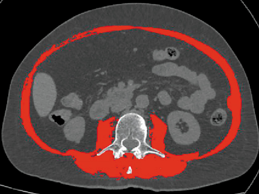 Из сопутствующих заболеваний обращало на себя внимание наличие бронхиальной астмы (неаллергическая форма, легкое персистирующее течение, дыхательная недостаточность 0), гипертонической болезни I стадии 1-й степени, а также астеноневротического синдрома. Пациентка наблюдалась у психиатра в связи с наличием недифференцированного соматоформного расстройства, по поводу которого ежедневно получала флуоксетин (20 мг), оланзапин (10 мг). Потеря массы тела за предшествовавшие 6 мес превысила 28% от исходной, что соответствует наличию у пациентки кахексии. Оценено функциональное состояние: по данным динамометрии сила захвата доминантной руки составила 31 кг, недоминантной – 28,5 кг (пороговое значение для саркопении <16 кг для женщин), тест ходьбы на 400 м – 05 мин 51 с (пороговое значение – 6 мин). Проведен анализ скелетно-мышечной мускулатуры с помощью компьютерной томографии на уровне III поясничного позвонка (рис. 1). Площадь скелетной мускулатуры составила 106,5 см2, скелетно-мышечный индекс LIII (отношение площади мышц на уровне LIII позвонка к квадрату роста пациента) – 38,3 см2/м2. В соответствии с диагностическими критериями Prado (<38,5 см2/м2 для женщин) и Martin (<41 см2/м2 для женщин) данные результаты можно трактовать как наличие у больной саркопении [7, 8].