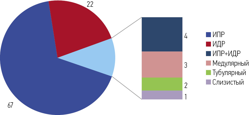 В соответствии с данными патоморфологического исследования в большинстве случаев диагностирован инфильтративно-протоковый рак (ИПР) молочной железы – 67% (n=55) больных. Инфильтративно-дольковый рак (ИДР) отмечен в 22% случаев (n=18), другие виды – 11,0% (n=9); рис. 1.