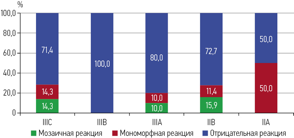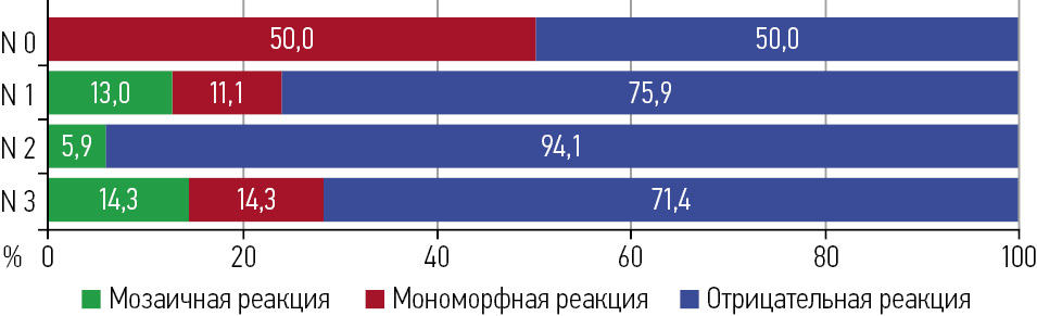 На рис. 3 представлены результаты оценки связи экспрессии HLA-DR-детерминанты со статусом лимфоузлов. Хотя статистической значимости не достигнуто (p=0,152), тем не менее можно видеть отчетливую тенденцию. Частота мономорфной экспрессии HLA-DR при статусе N0 достигает 50% (2/4), тогда как при увеличении количества метастатически пораженных лимфоузлов снижается, уступая место мозаичной экспрессии. Так, при N1 отмечается экспрессия в 11,1% (6/54) мономорфная, а в 13,0% (7/54) случаев – мозаичная. При N2 94,1% (16/17) опухолей вовсе не экспрессируют антиген HLA-DR, лишь в 5,9% (1/17) он представлен мозаично. При N3 процент антиген-негативных опухолей остается высоким – 71,4% (5/7). Вместе с тем признаки не являются достоверно взаимосвязанными. В работе Д.А. Бурова и соавт. cвязи поражения регионарных лимфатических узлов с экспрессией HLA-DR на опухолевых клетках также не установлено [26], тогда как в другом исследовании нашей лаборатории (Е.В. Артамонова) при отсутствии молекул HLA-DR на опухолевых клетках метастазы в регионарные лимфатические узлы выявлялись достоверно чаще [25].