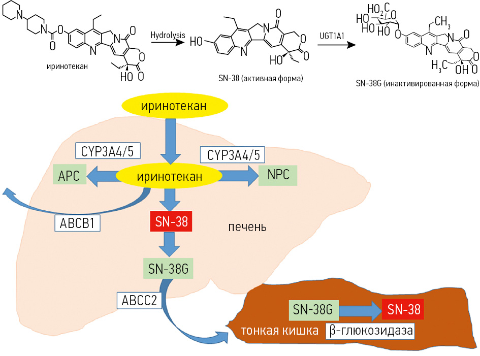 Рис. 1. Метаболизм иринотекана. В клетках печени иринотекан под действием CES1/2 (карбоксилэстеразы 1 и 2) трансформируется в активную форму SN-38 (7-этил-10-гидроксикамптотецин). Часть иринотекана расщепляется до метаболитов APC (7-этил-10-[4-N-(5-аминопентановая кислота)-1-пиперидино] карбонилоксикамптотецин) и NPC (7-этил-10-(4-амино-1-пиперидино) карбонилоксикамптотецин) с помощью CYP3A4/5 (3А4 и 3А5 изоформы цитохрома Р450). Дезактивация в неактивную форму SN-38G (глюкуронидированный SN-38) опосредуется UGT1A1 (уридин-дифосфат-глюкуронозил-трансфераза 1А1), частично β-глюкозидазой. Иринотекан и его метаболиты транспортируются Р-гликопротеином, белком клеточной мембраны. Экскреция SN-38G происходит с помощью MRP2/ABCC2 (белок-2, ассоциированный с множественной лекарственной устойчивостью).