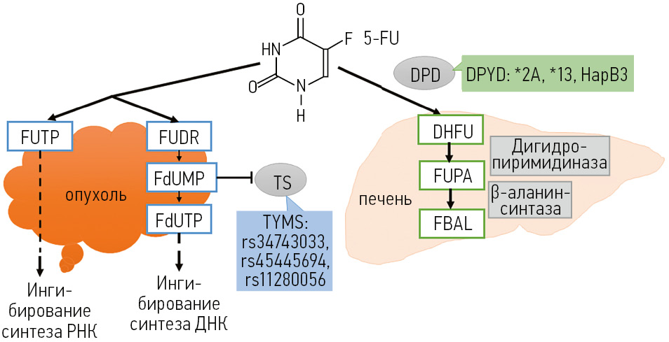 Современная фармакогеномика позволяет персонализировать применение химиотерапевтических препаратов, исходя из того, что индивидуальные генетические различия могут определять особенности фармакокинетики и фармакодинамики лекарственного вещества. Особо важное значение приобретают отдельные непатогенные варианты нуклеотидной последовательности, когда лекарство метаболизируется преобладающим специфическим образом. В частности, данная ситуация характерна для иринотекана и фторпиримидинов. Иными словами, индивидуальные различия в возникновении и тяжести нежелательных явлений в ходе терапии как иринотеканом, так и фторпиримидинами можно объяснить не только клиническими факторами (возраст, пол), но и генетическими особенностями пациента.