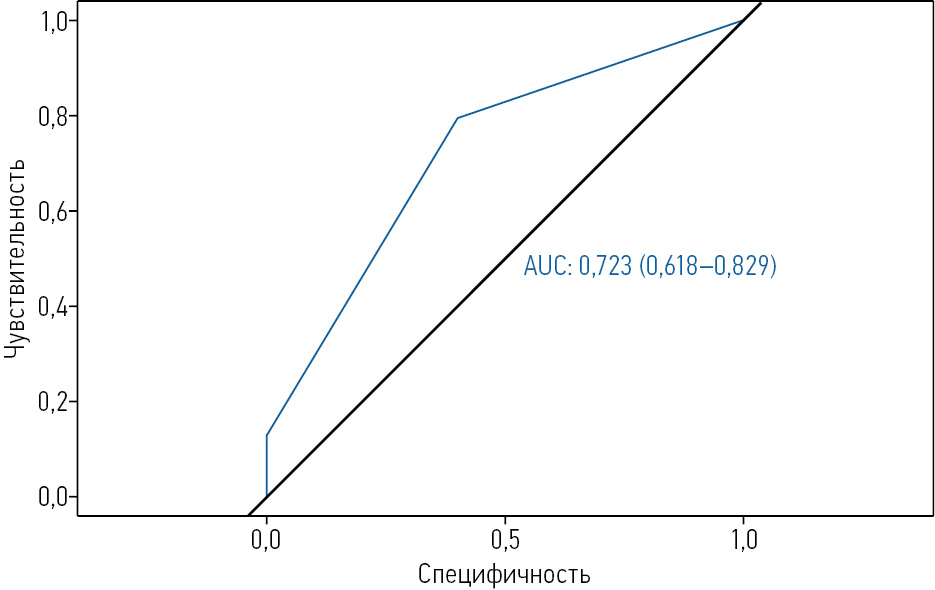 ROC-кривая, построенная для прогностического теста UGT1A1*28, демонстрирует специфичность 60%, чувствительность 79,5% теста на токсичность, площадь под кривой (AUC) 0,723 (рис. 3). В результате анализа ОНП-ОНП взаимодействия для двух аллелей *28 и *6 построена двулокусная модель прогноза, специфичность которой составила 63%, а чувствительность – 82%.