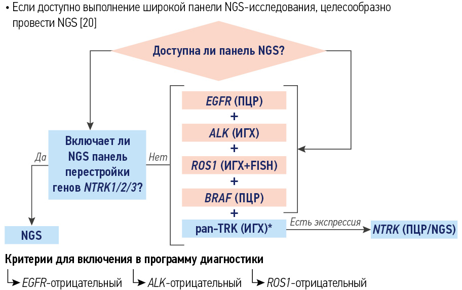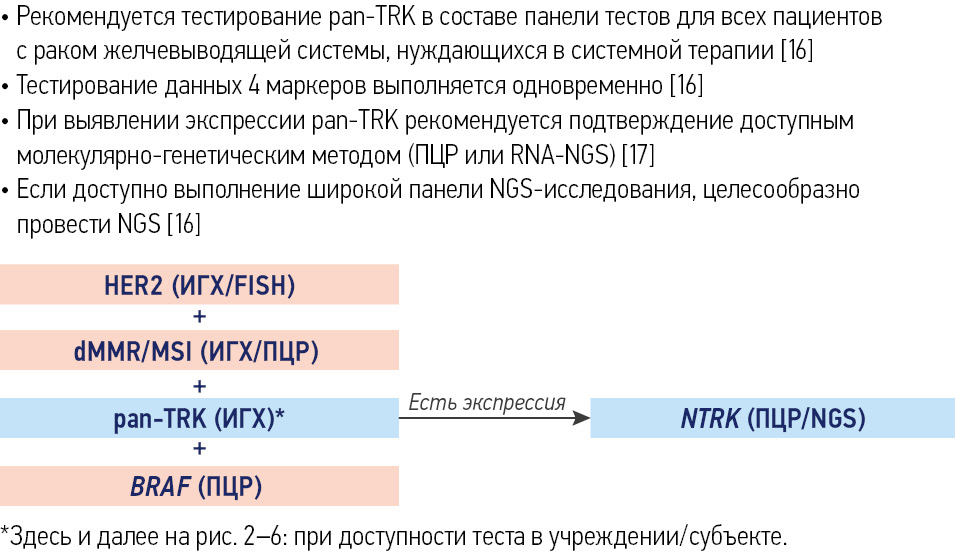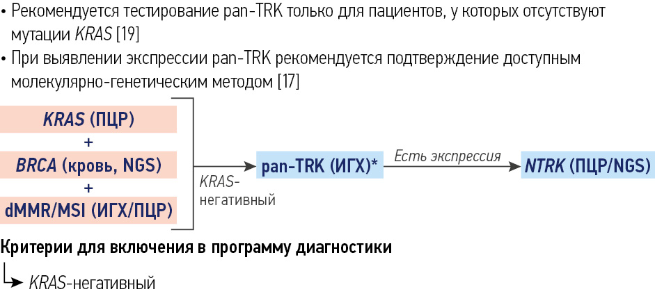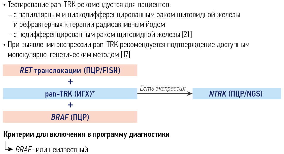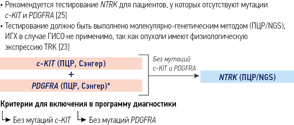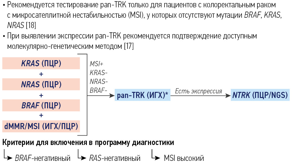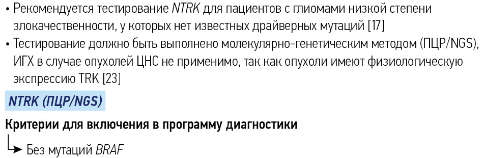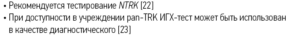 Обязательно применение молекулярно-генетических методов для выявления перестроек генов NTRK. Исследование методом полимеразной цепной реакции (ПЦР) и NGS-исследование являются предпочтительными. Тестирование может быть выполнено в рамках программы при поддержке АО «Рош-Москва».