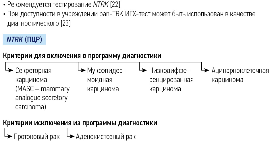 Описана группа опухолей, для которых транслокация гена NTRK является патогномоничной и встречается более чем в 90% случаев, у взрослых к ним относят секреторную карциному молочной железы/слюнных желез. Пациентов с данными гистологическими подтипами следует направлять на тестирование на наличие транслокаций в генах NTRK в первую очередь.