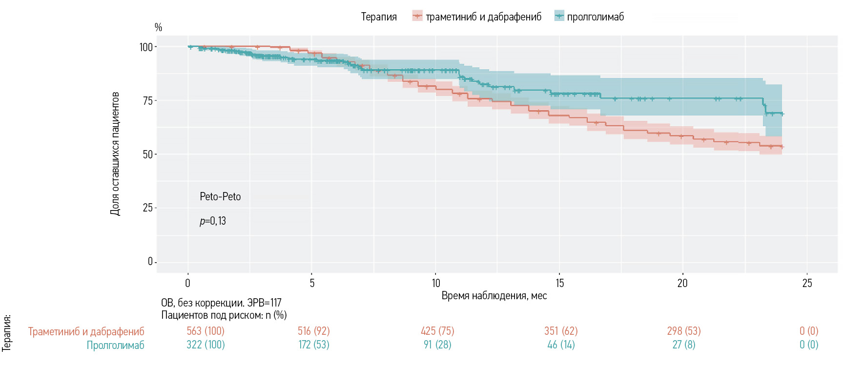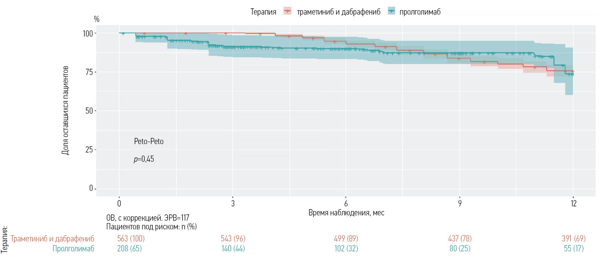 При взвешивании популяции пролголимаба не учтен BRAF-статус пациента, потому что для ингибиторов анти-PD-1 он не является значимым модификатором эффекта [26], поэтому в популяции пациентов, получавших пролголимаб, присутствовали как BRAF-положительные, так и BRAF-отрицательные случаи. Кроме того, рассмотрены и исключены как не влияющие на эффективность терапии следующие факторы: пол, возраст, статус PD-L1, статус ECOG, предшествующая иммунотерапия в адъюванте.