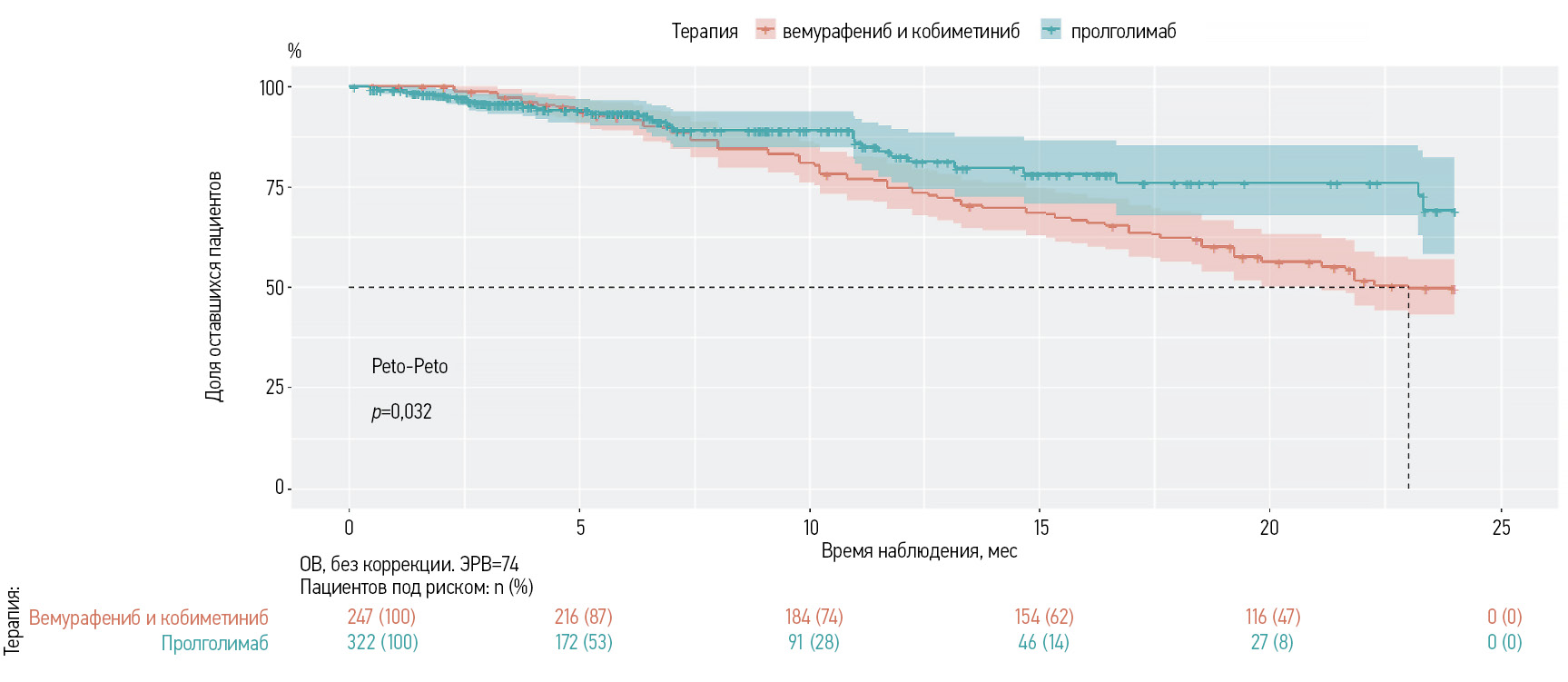 График сравнения терапии комбинацией кобиметиниб + вемурафениб и пролголимабом