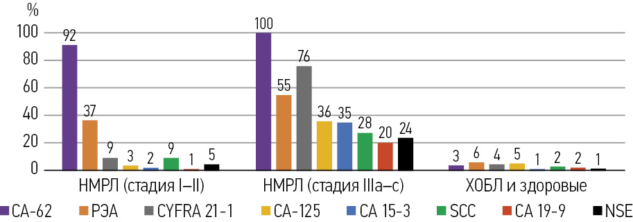 На рис. 1 представлены доли исследованных образцов сыворотки с повышенным уровнем маркеров среди больных с ранними (n=67) и поздними стадиями НМРЛ (n=74), условно здоровых добровольцев и больных ХОБЛ (n=163). Сравнение чувствительности исследованных ОМ при выявлении ранних стадий (I и II) НМРЛ выявило самую большую чувствительность (92%) для маркера СА-62 (см. рис. 1) по сравнению с РЭА, CYFRА 21-1 и SCC, которые уже используются в диагностике и мониторинге РЛ [10]. На местно-распространенной IIIa–c стадии с поражением бифуркационных лимфатических узлов или лимфоузлов средостения чувствительность маркеров убывает в следующем порядке: СА-62 (100%)<CYFRA 21-1 (75%)<РЭА (55%)<CA-125 (36%)<CА 15-3 (35%)<SCC (28%)<NSE (24%)<CA 19-9 (20%). В когорте пациентов с ХОБЛ использование рекомендованных пороговых величин для каждого ОМ выявило незначительное количество ложноположительных результатов: от 1,2% для СА 15-3 до 5,5% для РЭА (см. рис. 1).