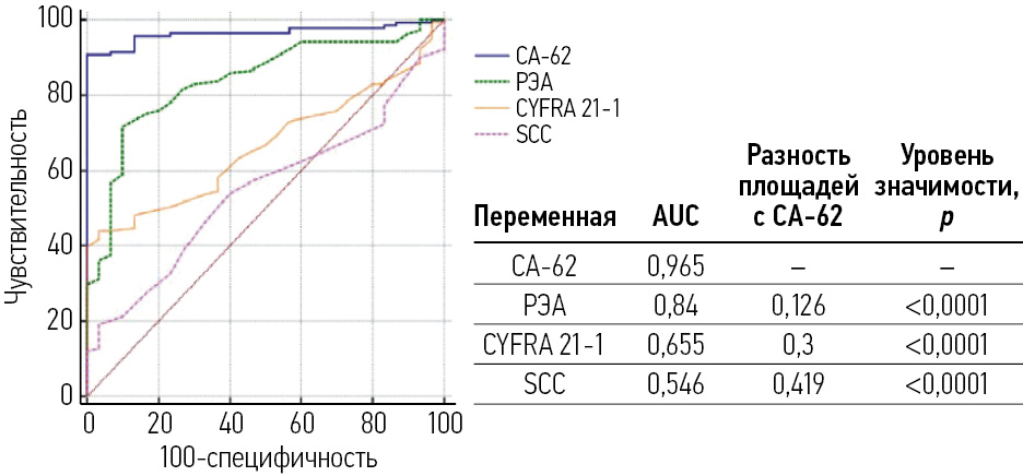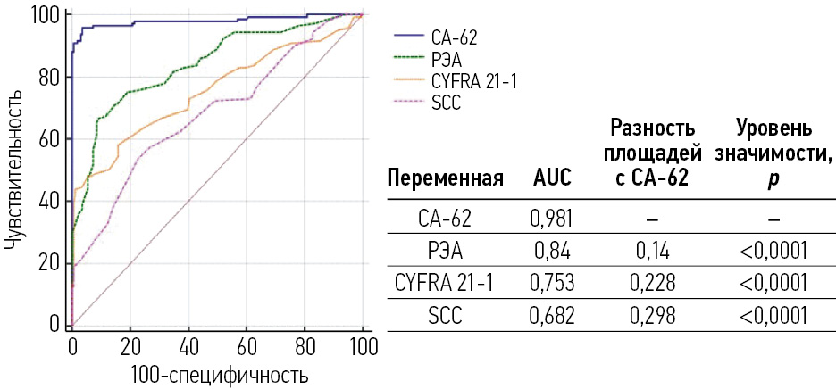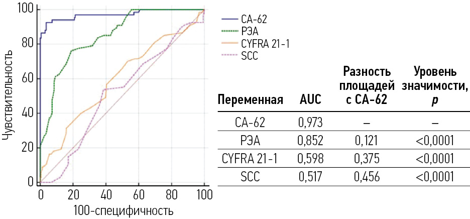 Сравнительный анализ ROC-кривых ОМ РЭА, CYFRA 21-1, SCC и CA-62 для всей когорты НМРЛ против всех условно здоровых добровольцев и больных ХОБЛ (рис. 2) показал достоверное различие в значениях AUC между СА-62 (AUC=0,981) и другими маркерами (разность площадей AUC=0,21–0,7) для всей когорты больных: РЭА (AUC=0,84)>CYFRA 21-1 (AUC=0,753)>SCC (AUC=0,682).