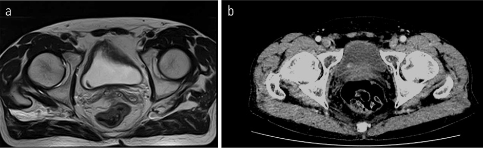 Fig. 2. Pelvic magnetic resonance imaging (MRI) dated 14.10.2021: tumor mass of irregular shape with ill-defined uneven contours with a mixed growth pattern. The size of the endophytic component is 40×21 mm, and the size of the exophytic component is 8×6 mm.