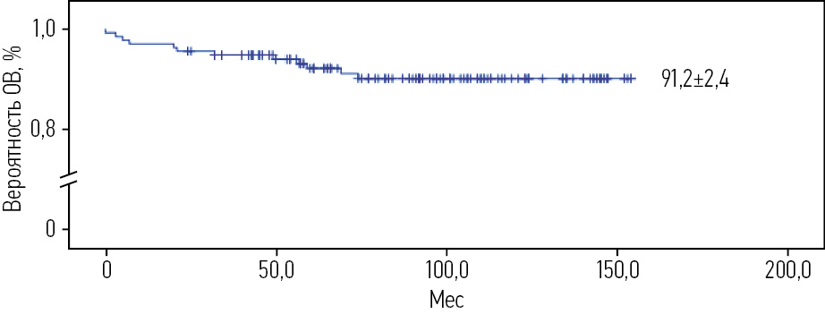 Для всех 136 пациентов с впервые диагностированным ОЛЛ, получавших терапию по протоколу ALL IC-BFM 2009, ОВ составила 91,2±2,4% при медиане наблюдения 92±3,3 мес (рис. 1). Двенадцать случаев завершились летальным исходом в связи с неудачей в лечении рецидива заболевания (7 человек), вторых опухолей – 1 (0,74%) ребенок с острым миелоидным лейкозом и 1 (0,74%) с глиобластомой, а также из-за развившейся токсичности во время терапии впервые установленного ОЛЛ – 3 (2,2%) пациента.
