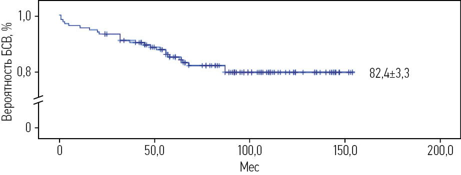 БСВ составила 82,4±3,3% при медиане наблюдения 87±3,4 мес (рис. 2). К 24 (17,6%) событиям отнесено 15 (11,0%) рецидивов, 2 (1,5%) случая ОЛЛ с МОБ-позитивным статусом на протяжении всей программной терапии, 3 (2,2%) летальных исхода из-за инфекционных осложнений и панкреонекроза, 3 (2,2%) вторых опухоли (острый миелоидный лейкоз, глиобластома и ОЛЛ) и 1 случай кардиотоксичности 3-й степени, в связи с которой пациент исключен из протокола.