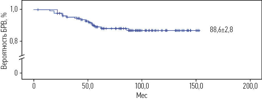 Безрецидивная выживаемость (БРВ), проанализированная среди детей с МОБ-негативным статусом (132 человека; 97,1%), составила 88,6±2,8% при медиане наблюдения 89±3,3 мес (рис. 3). Рецидивы ОЛЛ выявлены у 15 (11,4%) больных, 7 (5,3%) из которых завершились прогрессией заболевания и летальным исходом.