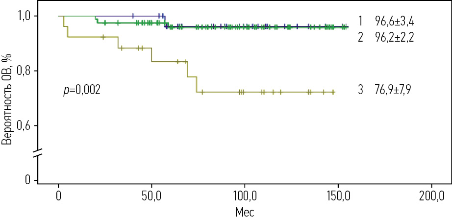 Рис. 4. ОВ пациентов с ОЛЛ в зависимости от группы риска, получавших терапию по протоколу ALL IC-BFM 2009 (1 – стандартная группа, 2 – средняя группа, 3 – высокая группа риска).