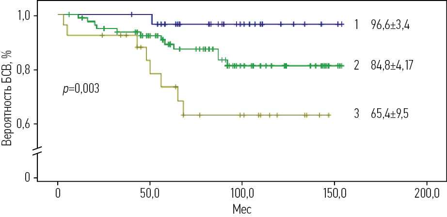 Рис. 5. БСВ пациентов с ОЛЛ в зависимости от группы риска, получавших терапию по протоколу ALL IC-BFM 2009 (1 – стандартная группа, 2 – средняя группа, 3 – высокая группа риска).