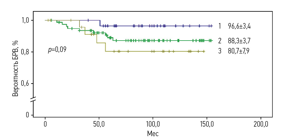 Рис. 6. БРВ пациентов с ОЛЛ в зависимости от группы риска, получавших терапию по протоколу ALL IC-BFM 2009 (1 – стандартная группа, 2 – средняя группа, 3 – высокая группа риска).