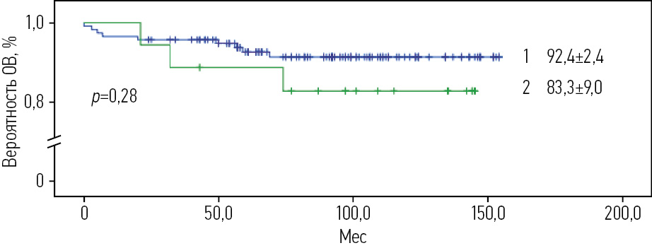 Рис. 7. ОВ пациентов с ОЛЛ в зависимости от иммуноподварианта, получавших терапию по протоколу ALL IC-BFM 2009 (1 – ОВ для В-ОЛЛ, 2 – ОВ для Т-ОЛЛ).