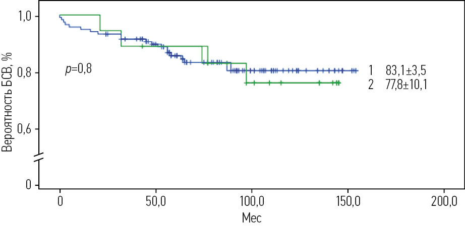 Рис. 8. БСВ пациентов с ОЛЛ в зависимости от группы риска, получавших терапию по протоколу ALL IC-BFM 2009 (1 – БСВ для В-ОЛЛ, 2 – БСВ для Т-ОЛЛ).