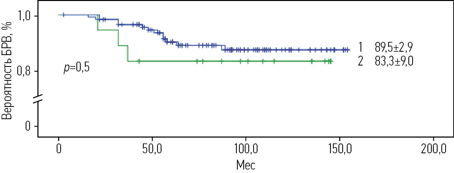 Рис. 9. БРВ пациентов с ОЛЛ в зависимости от группы риска, получавших терапию по протоколу ALL IC-BFM 2009 (1 – БРВ для В-ОЛЛ, 2 – БРВ для Т-ОЛЛ).