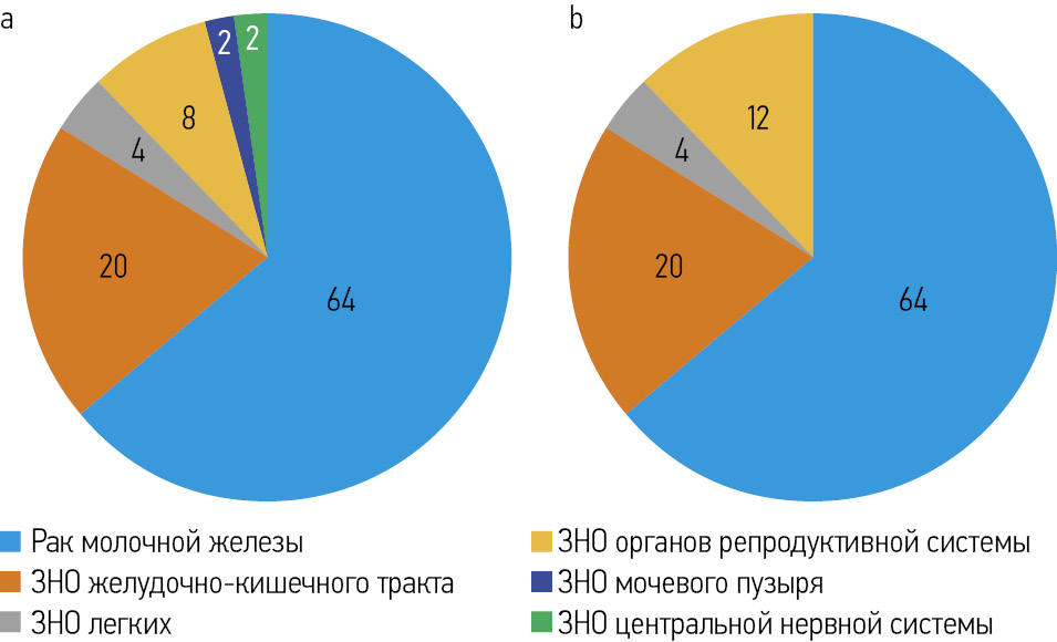 Materials and methods. The analysis included 100 vaccinated patients aged 22 to 84 with metastatic or inoperable solid tumors who received cytostatic therapy with or without a targeted agent. The median age was 56.5 years in Group 1 and 57.7 years in Group 2. In both groups, 32 (64%) patients had breast cancer, 10 (20%) had gastric, colon, and rectal cancers, 2 (4%) had lung cancer, 4 (8%), and 6 (12%) had reproductive cancers. In addition, Group 1 included 1 patient each with bladder and brain cancer. All were treated with antitumor drug therapy following clinical guidelines according to tumor localization.
