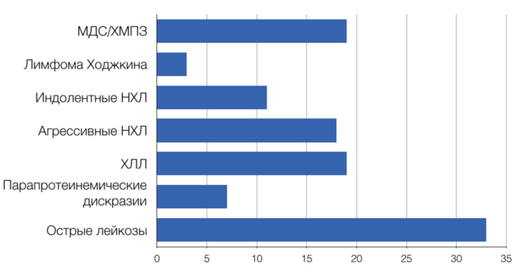 С 24.04.2020 по 31.05.2020 на базе гематологической службы ГБУЗ ГКБ №52 наблюдались 110 пациентов онкогематологического профиля с новой коронавирусной инфекцией, госпитализированных по скорой медицинской помощи: 59 женщин и 51 мужчина с медианой возраста 58 (18–90) лет. Варианты онкогематологической патологии были представлены с разной частотой: из 110 больных 33 (30%) составили острые лейкозы, 19 (17,5%) – В-клеточный хронический лимфолейкоз (ХЛЛ), 19 (17,5%) – миелодиспластический синдром (МДС)/хронические миелопролиферативные заболевания (ХМПЗ), 18 (16%) – агрессивные неходжкинские лимфомы (НХЛ), 11 (10%) – индолентные НХЛ, 7 (6%) – парапротеинемические дискразии и 3 (3%) – лимфома Ходжкина (см. рисунок).