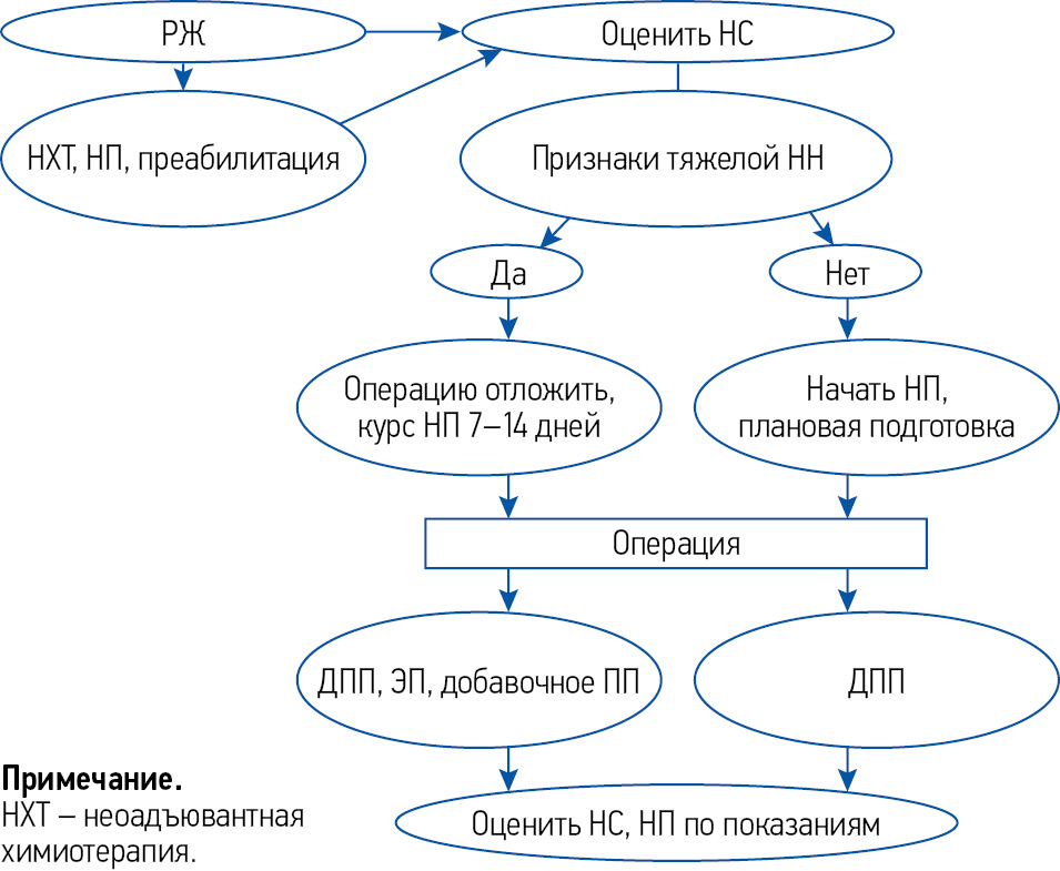 В заключение мы хотим привести пример алгоритма НП при РЖ, используемый в нашем центре (рис. 3). Очевидно, что после гастрэктомии или субтотальной резекции желудка пациент не сможет адекватно питаться самостоятельно в течение 5–7 сут, что само по себе является фактором риска НН и показанием для начала НП пероральным доступом. Пациенту даются рекомендации по диетическому питанию, приему ДПП и дозированной физической нагрузке. При наличии признаков тяжелой НН операция откладывается и проводится курс предоперационной НП длительностью 7–14 дней. В раннем послеоперационном периоде пациенту разрешается пероральный прием жидкости и смеси для ДПП небольшими глотками, начиная с 200 мл в день, с постепенным расширением объема в зависимости от переносимости. При наличии тяжелой НН операция завершается установкой питательного зонда за дистальный анастомоз, и НП проводится с использованием ЭП и добавочного ПП. Если пациенту запланировано неоадъювантное лечение, то все время его проведения используется для осуществления преабилитационных мероприятий, в том числе НП. По завершении лечения пациенту даются дальнейшие рекомендации по питанию и образу жизни.