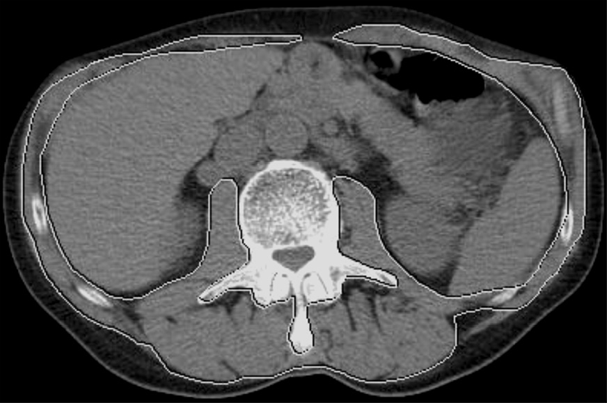 - выбор среза. Из 4–5 КТ-срезов, полученных на уровне LIII позвонка, выбирали наиболее подходящий, ориентируясь на более четкие границы периметра мышц живота и тела позвонка;