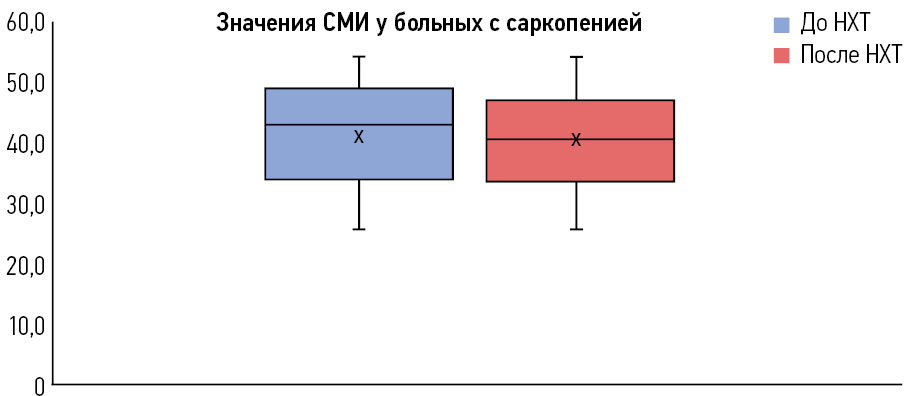 Рис. 2. Значения СМИ до и после НХТ у 41 пациента с саркопенией (p≤0,01).