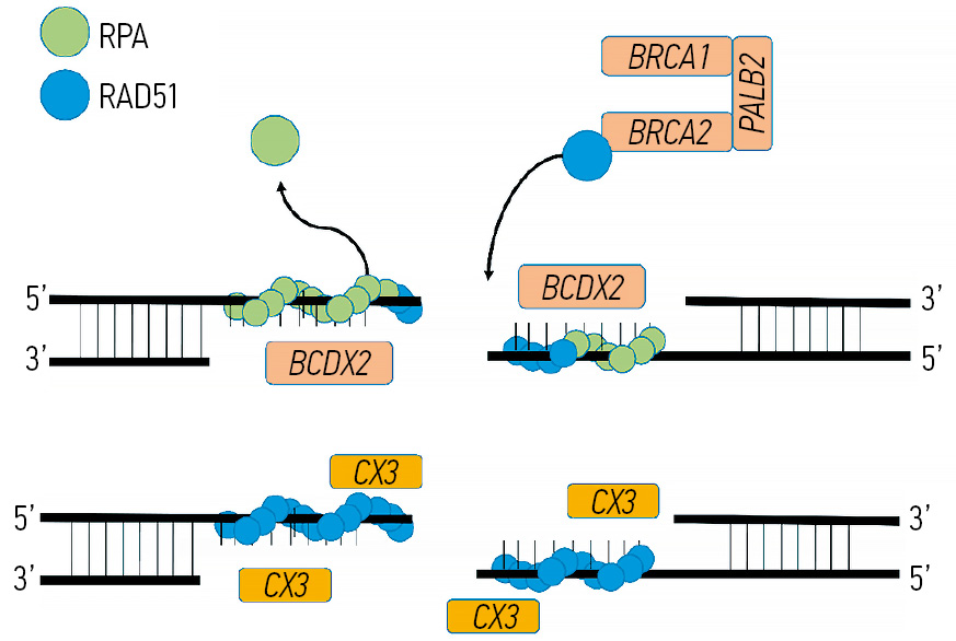 - Chun J, Buechelmaier ES, Powell SN. Rad51 paralog complexes BCDX2 and CX3 act at different stages in the BRCA1-BRCA2-dependent homologous recombination pathway. Mol Cell Biol. 2013;33(2):387-95. doi: 10.1128/MCB.00465-12