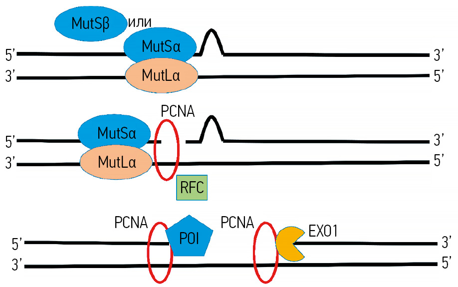 Рис. 2. Функционирование системы MMR: MutSβ или MutSα узнают и связываются с местом несовпадения, после чего рекрутируются другие комплексы, в первую очередь MutLα (гетеродимер MLH1-PMS2), ядерный антиген пролиферирующих клеток (PCNA) и фактор репликации С (RFC). Сборка инициирует эндонуклеазную активность PMS2, которая делает одноцепочечные разрывы вблизи несоответствия и открывает сайт для входа экзонуклеазы 1 (EXO1), приводящей к окончательной диссоциации поврежденного участка ДНК, а полимераза (Pol) достраивает комплементарную цепь.