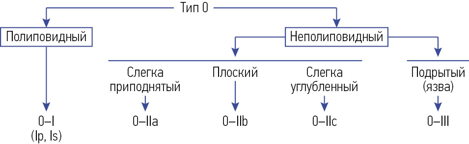 Рекомендуется описывать тип роста эпителиальных новообразований толстой кишки по Парижской эндоскопической классификации поверхностных неопластических поражений. Для описания формы новообразования необходимо использовать Парижскую эндоскопическую классификацию поверхностных неопластических поражений (рис. 1) [1]. Согласно оригинальной версии Парижской классификации, опубликованной в 2002 г., выделяют основные типы новообразований: