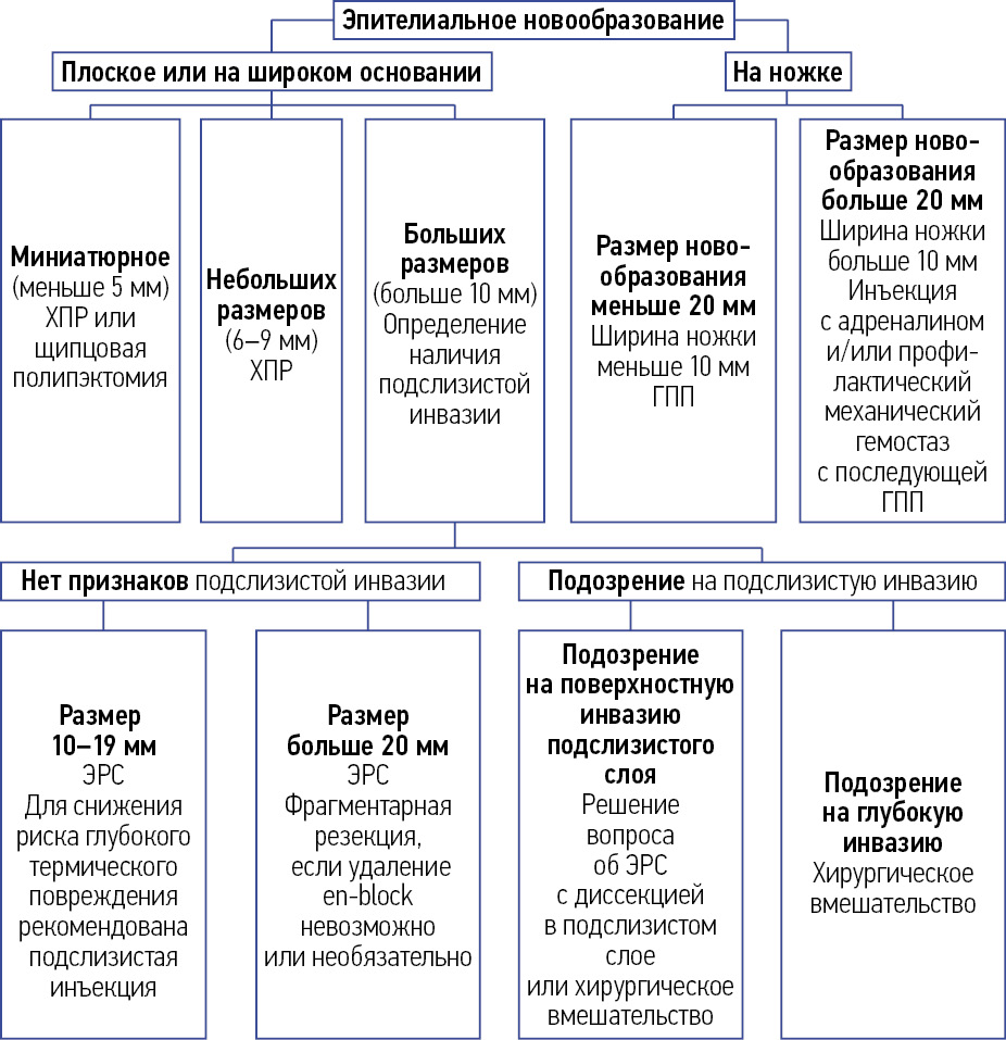 - Для удаления новообразований размерами 10–19 мм с неполиповидным типом роста рекомендуется выполнение ЭРС.