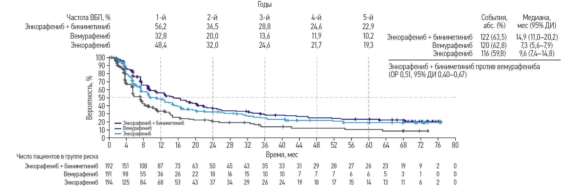 Частота объективных ответов (ЧОО) в группе КОМБО450 составила 64,1% (95% Доверительный интервал – ДИ 56,8–70,8) по сравнению с 40,8% (95% ДИ 33,8–48,2) в группе ВЕМ и 51,5% (95% ДИ 44,3–58,8) в группе ЭНКО300. Медиана выживаемости без прогрессирования (ВБП) – 14,9 мес (95% ДИ 11,0–20,2) при терапии КОМБО450, 9,6 мес (95% ДИ 7,4 –14,8) при ЭНКО300 и 7,3 мес (95% ДИ 5,6–7,9) при ВЕМ. Применение КОМБО450 сопровождалось увеличением ВБП по сравнению с ВЕМ (отношение рисков – ОР 0,51, 95% ДИ 0,40–0,67). Медиана ОВ в группе КОМБО450 составила 33,6 мес (95% ДИ 24,4–39,2), в группе ЭНКО300 – 23,5 мес (95% ДИ 19,6–33,6) и в группе ВЕМ – 16,9 мес (95% ДИ 14,0–24,5). Пятилетняя ОВ в группе КОМБО450 – 35% по сравнению с 21,4% в группе ВЕМ и 34,9% в группе ЭНКО300.