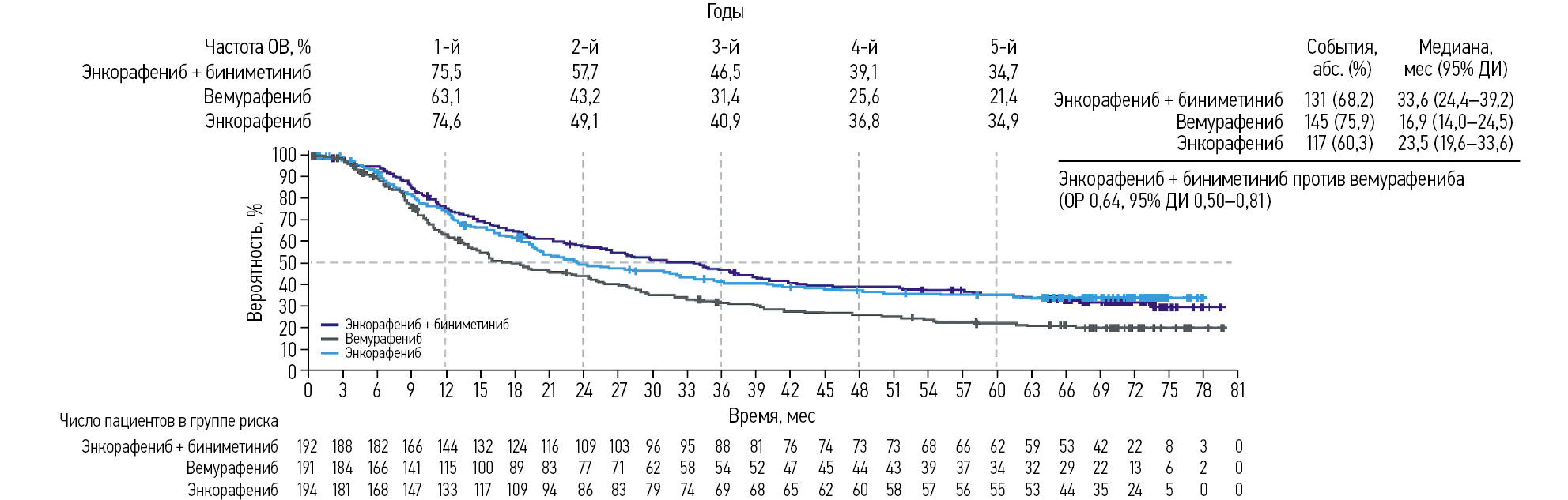 В исследование COLUMBUS было включено 577 пациентов с метастатической меланомой с мутацией в гене BRAF V600, не получавших предшествующего лечения, или с прогрессированием заболевания после первой линии иммунотерапии. Пациентов рандомизировали в соотношении 1:1:1 в группы комбинированной терапии энкорафенибом в дозе 450 мг 1 раз в сутки и биниметинибом в дозе 45 мг 2 раза в сутки (КОМБО450) или монотерапии вемурафенибом по 960 мг 2 раза в сутки (ВЕМ) или энкорафенибом по 300 мг 1 раз в сутки (ЭНКО300). Все препараты применяли перорально. Включение участников в исследование проходило с 30 декабря 2013 г. по 10 апреля 2015 г. Всего на I этапе рандомизировано 577 пациентов: КОМБО450 – 192; ЭНКО300 – 194 и ВЕМ – 191. Характеристики участников не различались между группами терапии. Во всех группах медиана продолжительности наблюдения для оценки общей выживаемости (ОВ) составила 48,8 мес.
