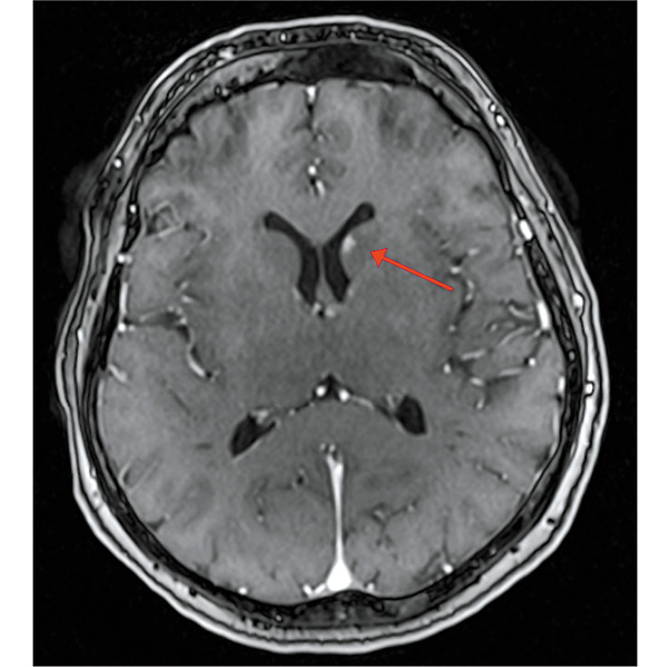 Пациентка продолжала исследуемую терапию, когда в марте 2018 г. на МРТ головного мозга с в/в контрастированием по поводу периодически беспокоящих головных болей выявлен единичный мтс в области головки хвостатого ядра левого полушария большого мозга до 5 мм без перифокального отека (рис. 7). По всей видимости, этот очаг обнаружен случайно, поскольку такой небольшой мтс не должен вызывать симптомы, что обусловливает необходимость регулярного обследования головного мозга у пациентов с распространенной меланомой при помощи МРТ с в/в контрастированием (в процессе терапии и несмотря на достижение глубокого радиологического ответа).