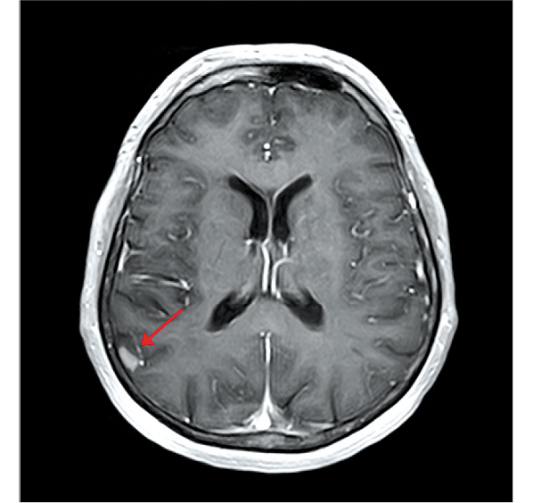 В марте 2022 г. при плановом обследовании выявлен новый мтс в головном мозге, локализованный в правой теменной доле, размерами до 9 мм (рис. 8).
