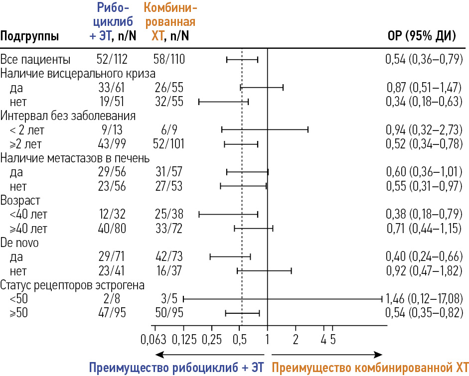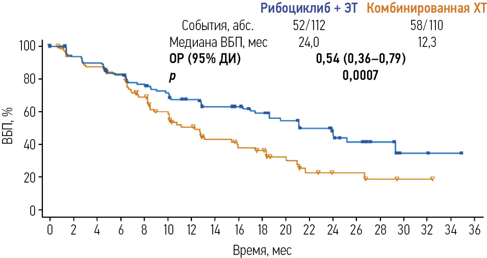 - ХТ по выбору врача (доцетаксел + капецитабин, или паклитаксел + гемцитабин, или капецитабин + винорелбин). Важно, что согласно дизайну исследования пациентки имели потенциально гормоночувствительный рак (уровень экспрессии ER>10%) и не получали какой-либо терапии по поводу распространенной стадии до включения в исследование. Контрольные обследования для оценки эффективности лечения проводились 1 раз в 6 нед в первые 12 нед терапии, затем 1 раз в 8 нед до 32 нед, далее – 1 раз в 3 мес. При медиане наблюдения 24 мес лечение рибоциклибом продолжалось у 46% больных, что в 2 раза больше, чем в группе с ХТ (23,6%); прогрессирование заболевания как основная причина отмены терапии отмечено значимо реже на комбинированной ЭТ по сравнению с ХТ (44,6% vs 52,7%). Рибоциклиб обеспечивал значимое снижение риска рецидива на 46% и увеличение медианы выживаемости без прогрессирования (ВБП) с 12,3 до 24 мес; p=0,0007 (рис. 1); преимущество назначения рибоциклиба отмечено в большинстве подгрупп, в том числе у больных с висцеральным кризом и гормонорезистентностью (рис. 2) [1].