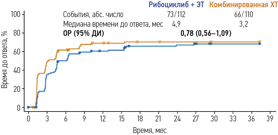 При этом уровень противоопухолевого ответа был не только высоким (частота объективного ответа – ЧОО – 65,2% vs 60%, клинической эффективности – КЭ – 80,4% vs 72,7% в пользу рибоциклиба), но и быстрым (время до развития ответа – 4,9 мес vs 3,2 мес); рис. 3 и 4 [1].