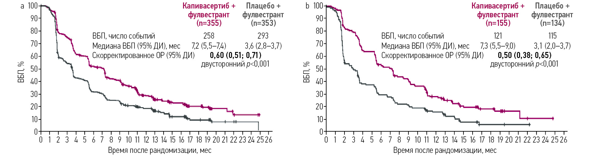 Рис. 7. ВБП в общей группе (а) и в группе больных с AKT-альтерацией (b) в исследовании CAPItello-291 [7].