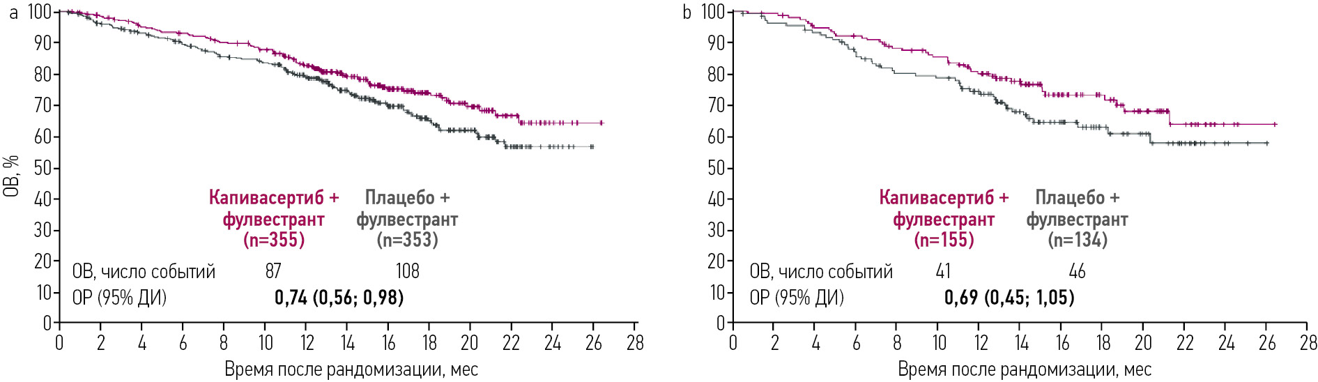 Рис. 8. ОВ в общей группе (а) и в группе больных с AKT-альтерацией (b) в исследовании CAPItello-291 [7].