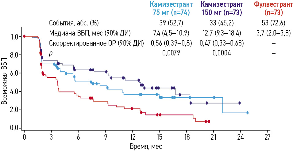 При независимой оценке терапия камизестрантом показывала преимущество перед фулвестрантом в увеличении ВБП (медиана 7,4 мес при камизестранте в дозе 75 мг, 12,7 мес – при дозе 150 мг vs 3,7 мес – при терапии фулвестрантом), различия высоко значимы (рис. 9) [9].