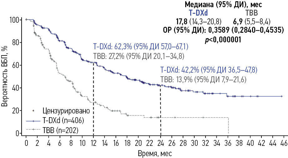 Терапия T-DXd в дозе 5,4 мг/кг 1 раз в 3 нед по сравнению с ТВВ привела к значимому снижению риска рецидива на 65% и увеличению ВБП (медиана – 17,8 мес vs 6,9 мес; p<0,000001); 1 и 2 года без прогрессирования пережили 62,3 и 42,2% пациенток на T-DXd против 27,2 и 13,9% больных на ТВВ (рис. 10) [11].