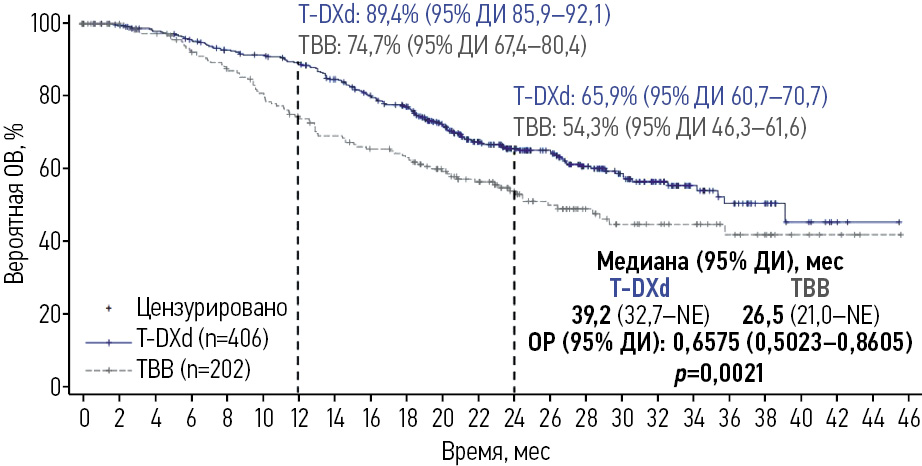 Несмотря на небольшой срок наблюдения (медиана – 21,5 мес), терапия T-DXd привела к значимому снижению риска смерти на 35% и увеличению ОВ (медиана – 39,2 мес vs 26,5 мес; р=0,0021); благодаря T-DXd 1 и 2 года пережили 89,4 и 65,9% больных, в то время как при терапии по выбору врача – 74,7 и 54,3% соответственно (рис. 11).