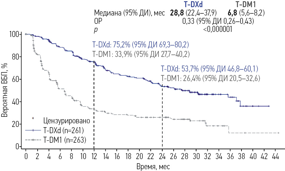 Рис. 12. ВБП в исследовании DESTINY-Breast 03 (обновленные результаты при медиане наблюдения 28 мес) [12].