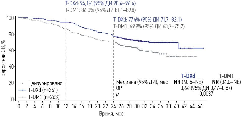 Рис. 13. ОВ в исследовании DESTINY-Breast 03 (обновленные результаты при медиане наблюдения 28 мес) [12].
