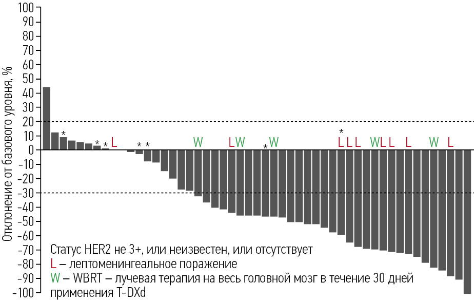 Таким образом, авторы исследования ROSET BM study продемонстрировали высокую эффективность терапии T-DXd в популяции больных с предлеченным HER2+ РМЖ с метастатическим поражением ГМ; чрезвычайно важно, что эффективность лечения была высока и не зависела от локализации и активности метастазов, что делает терапию T-DXd универсальной в такой сложной клинической ситуации [14].