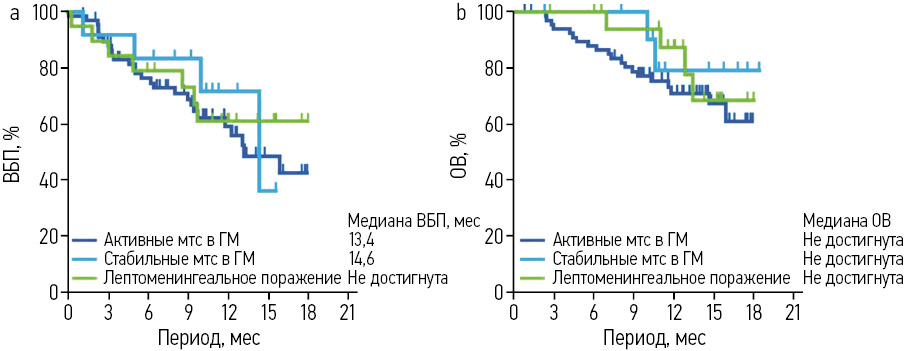 Рис. 15. Показатели ВБП (а) и ОВ (b) в исследовании ROSET BM в зависимости от вида метастазов (мтс) в ГМ [14].