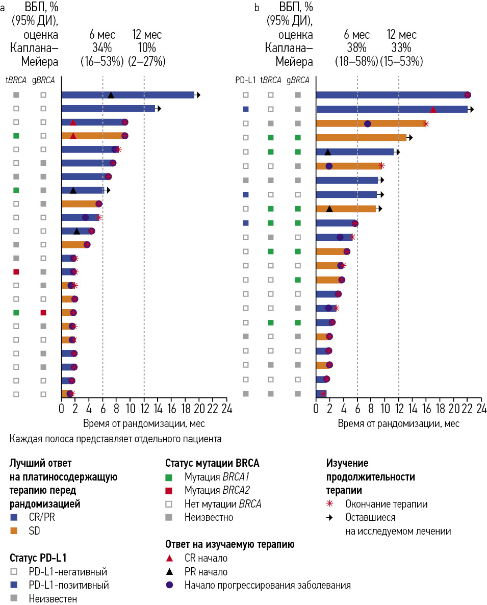 Рис. 16. ВБП у больных в исследовании DORA в зависимости от BRCA и PD-L1 статуса: а – группа олапариба; b – группа олапариб + дурвалумаб [19].