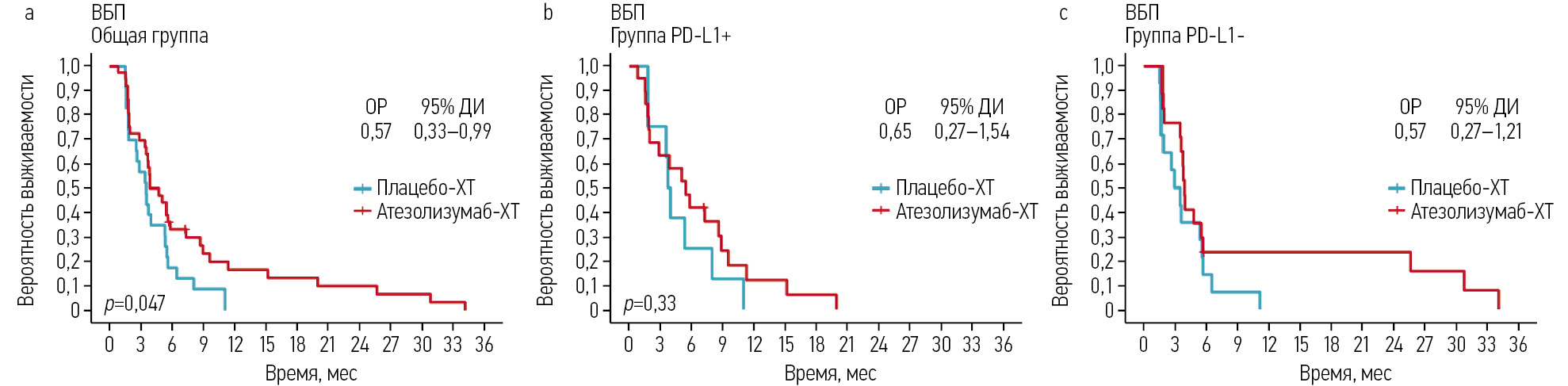 Рис. 17. ВБП в исследовании ALICE: а – общая группа; b – при PD-L1+ статусе; c – при PD-L1- статусе.