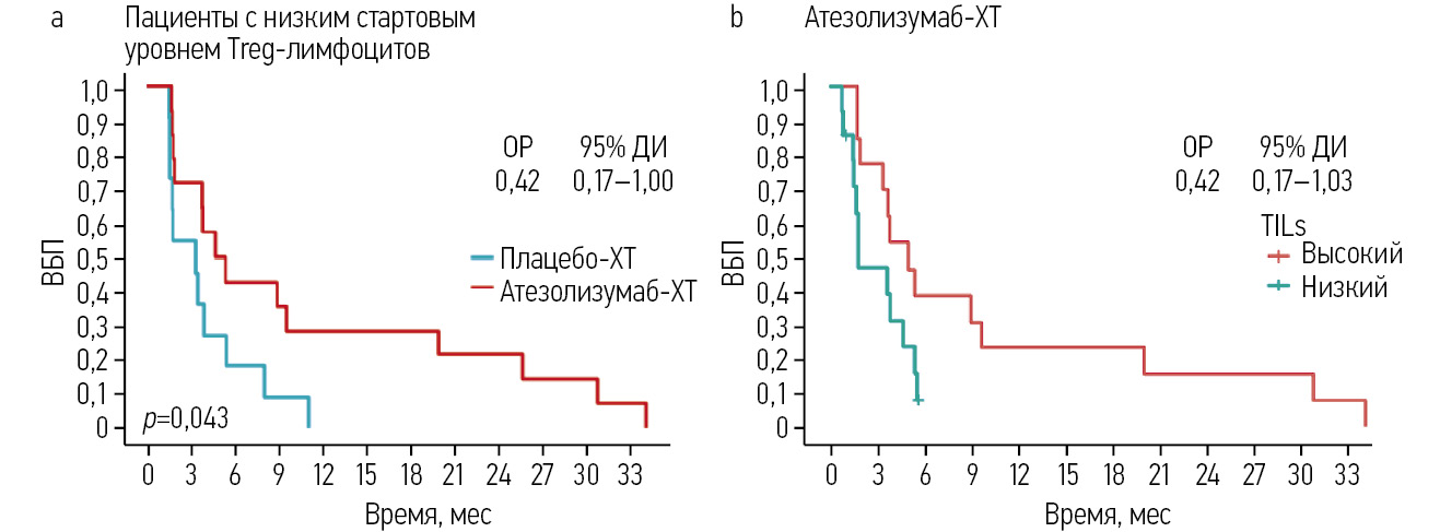 Рис. 18. Бенефит иммуномодулирующей ХТ с атезолизумабом в РКИ IIb фазы ALICE при низком стартовом уровне Treg-лимфоцитов (а) и высоком уровне TILs (b) [21].